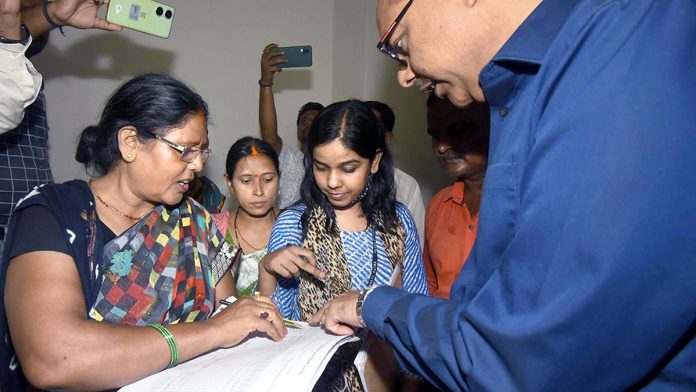 Enumerator staff collects informations from residents during the caste-based census survey, in Patna, Bihar.