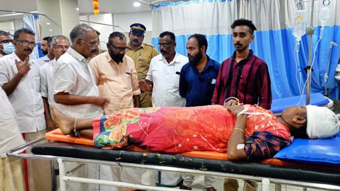 Forest Minister visiting an injured person in the jeep accident at Kannothumala, at the  Government Medical College Hospital at Mananthavady on Friday.