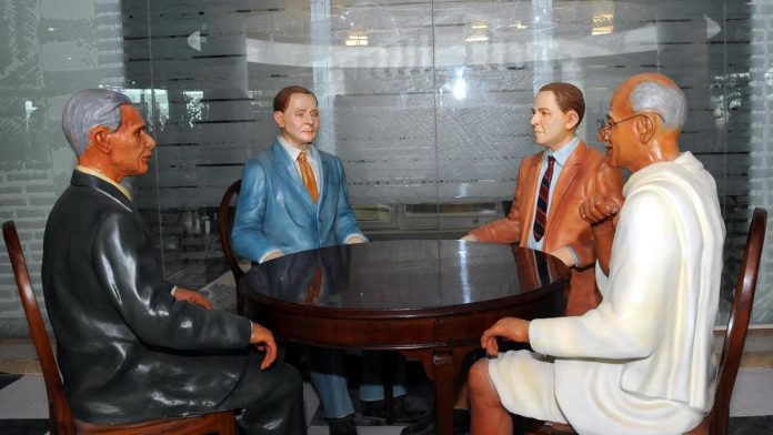 At the historic conference in New Delhi on June 07, 1947 at which Lord Mountbatten disclosed Britain’s “partition” plan for India. (left to right) Jawaharlal Nehru, Lord Ismay, Adviser to the Viceroy, Lord Mountbatten, and M.A. Jinnah, President of the All-India Muslim League.